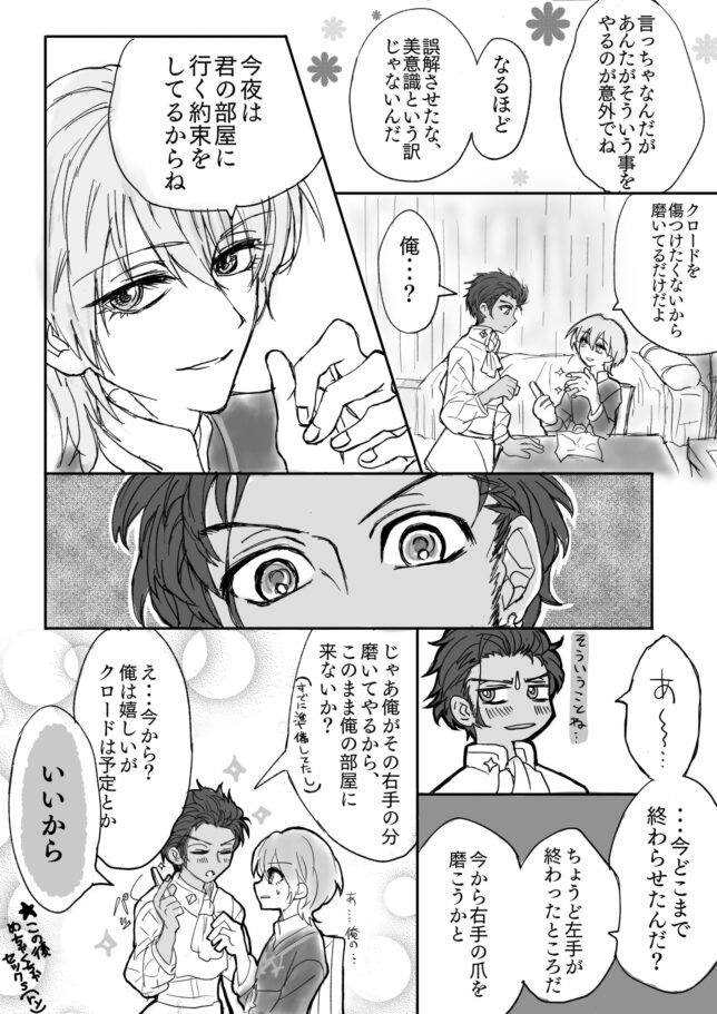 磨く理由 - 2/2 身だしなみの小話的な… 先生、お洒落自体にはあまり興味が無いイメージですが クロードの(大事なところを守る)ためなら そりゃあ手入れもしますよねっていう…下手すると傷ついちゃうから… 普段そんな事しないくせに…と思いながらも 先生の細やかな気遣いにギュンとくるクロードがいるといいよ…! 1 2